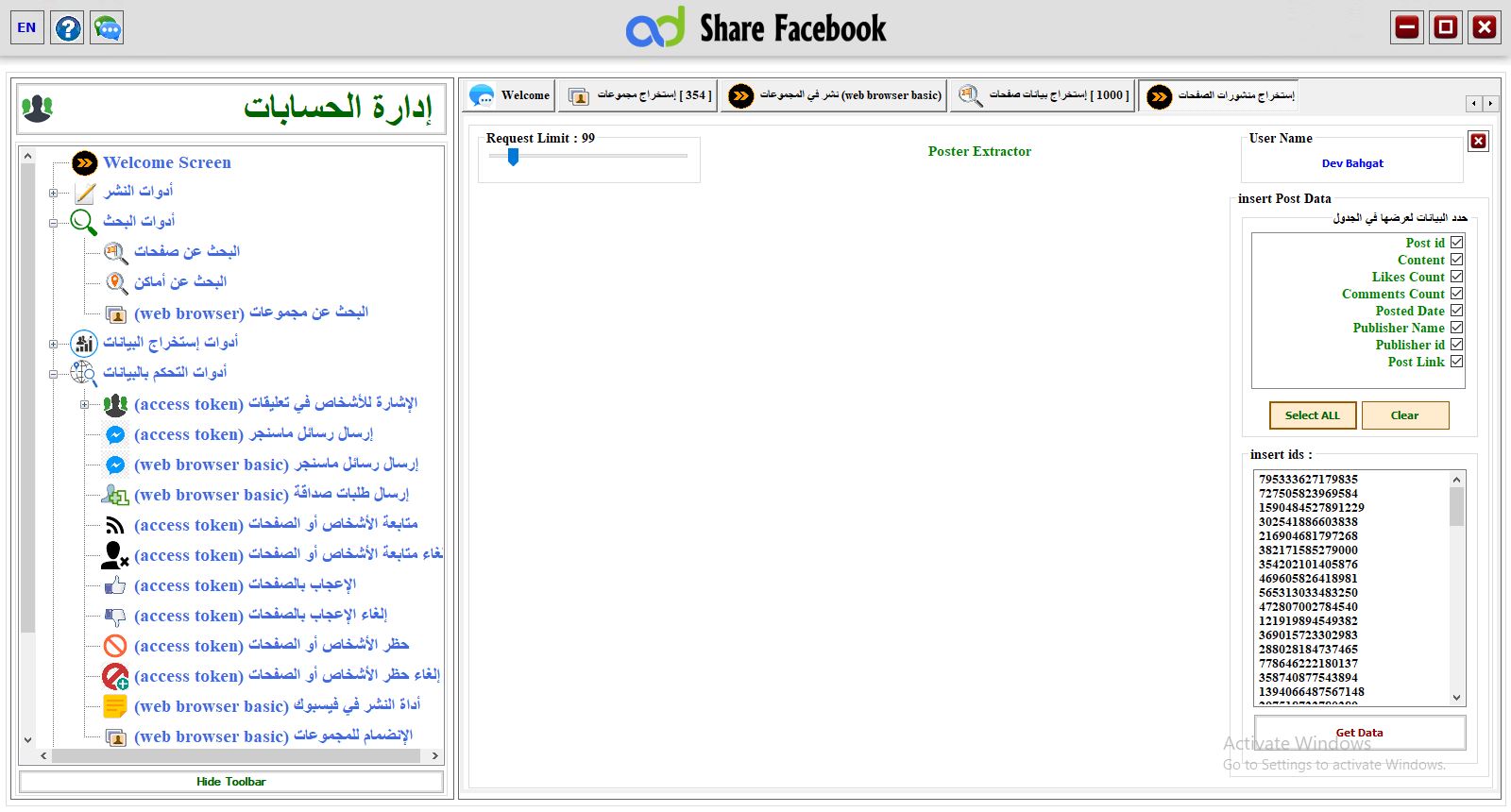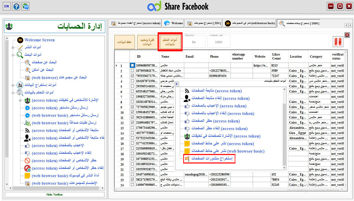 - نضغط بعد ذلك علي أدوات التحكم بالبيانات ونختار منها إستخراج منشورات الصفحات