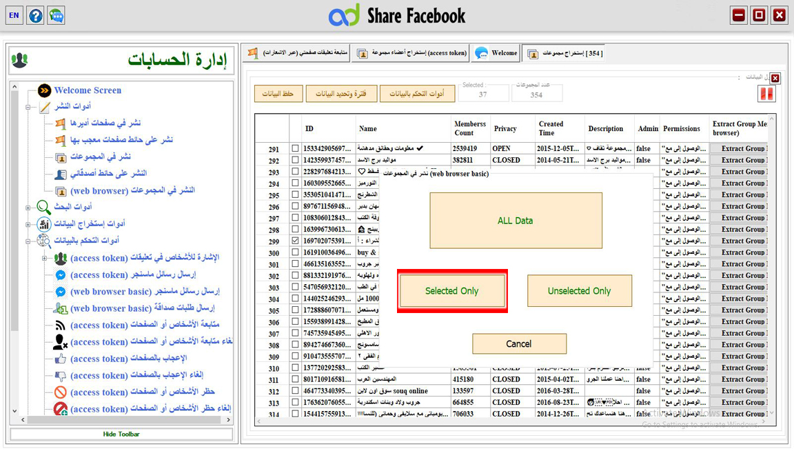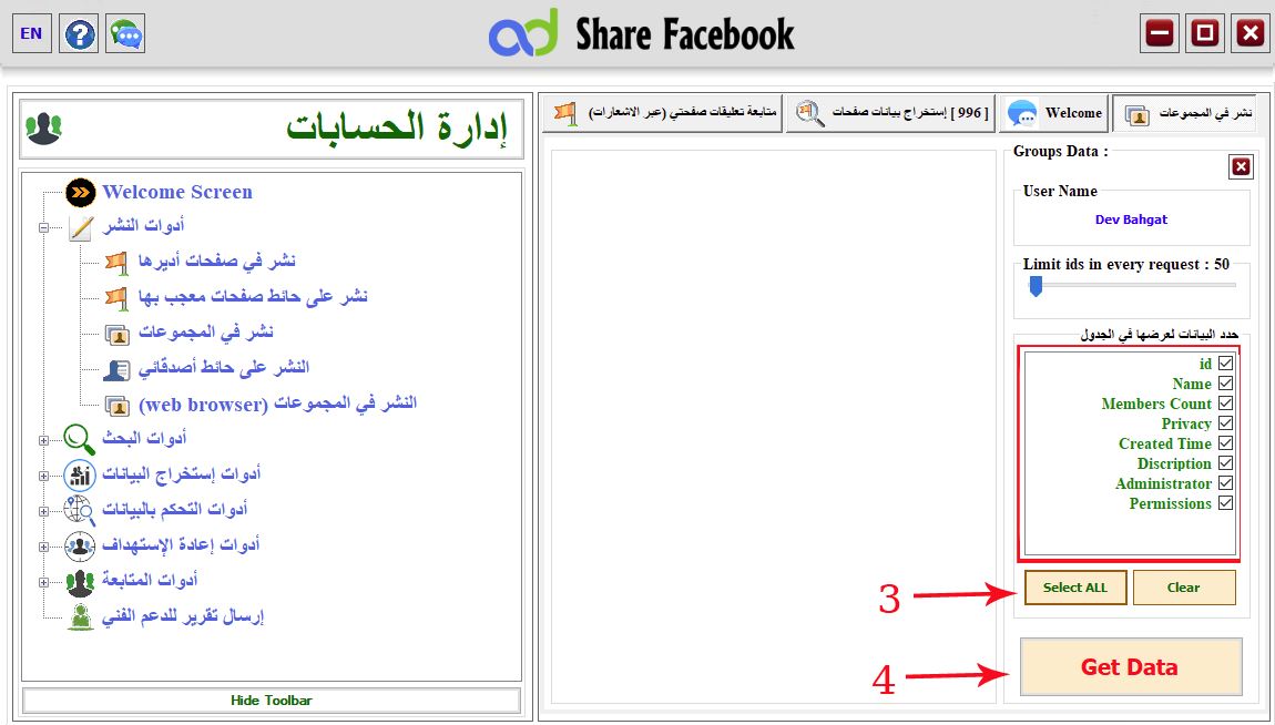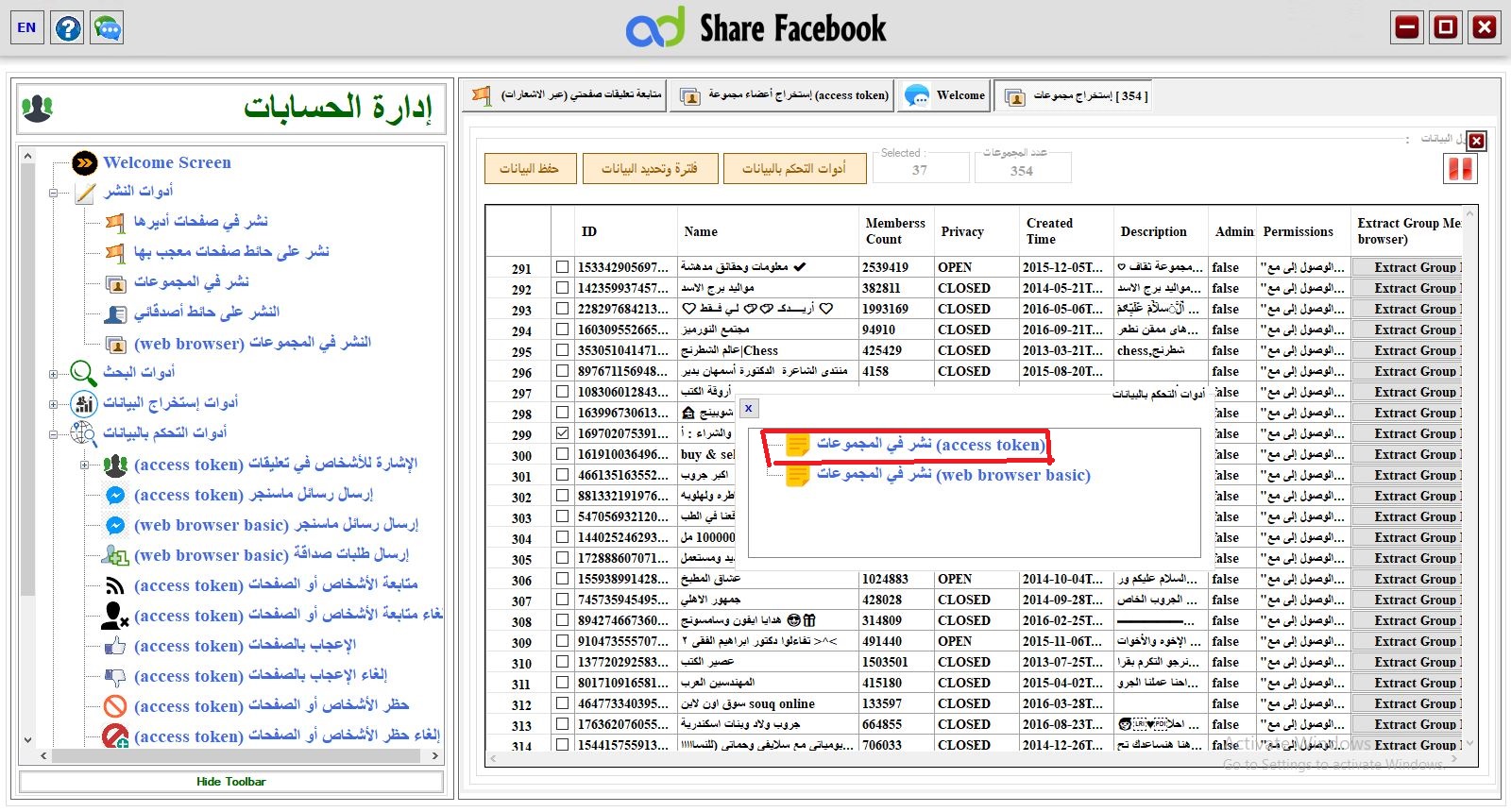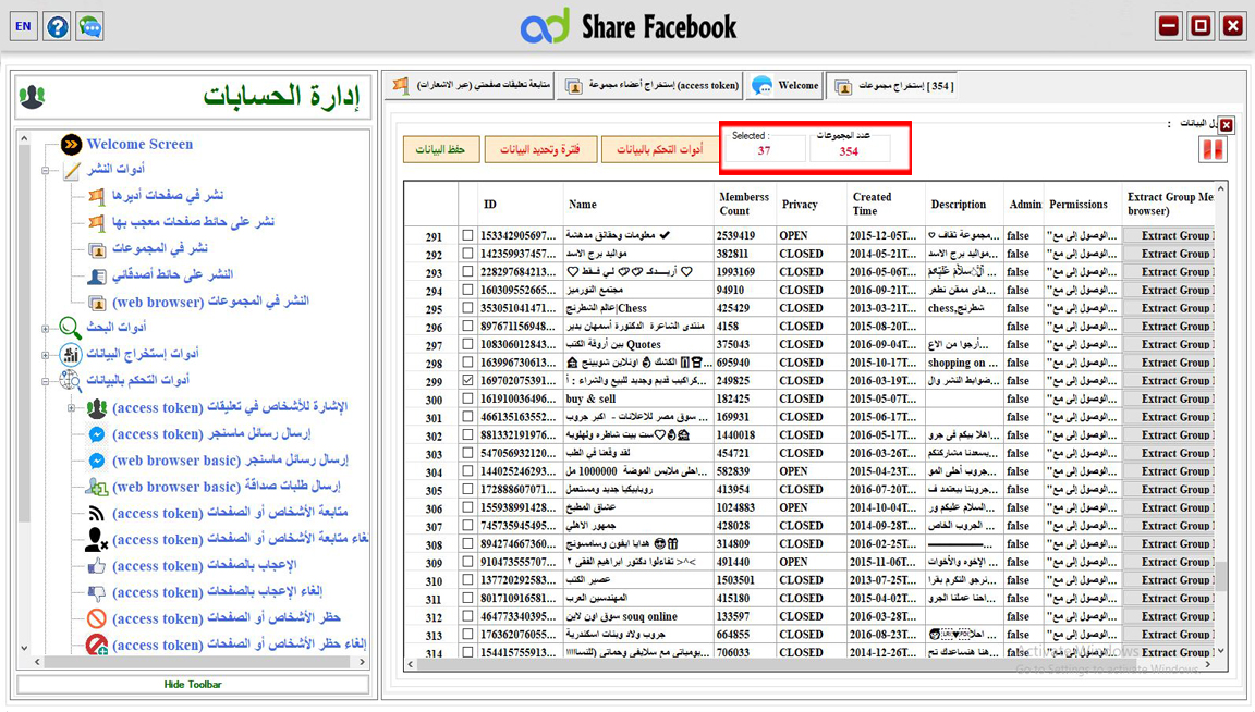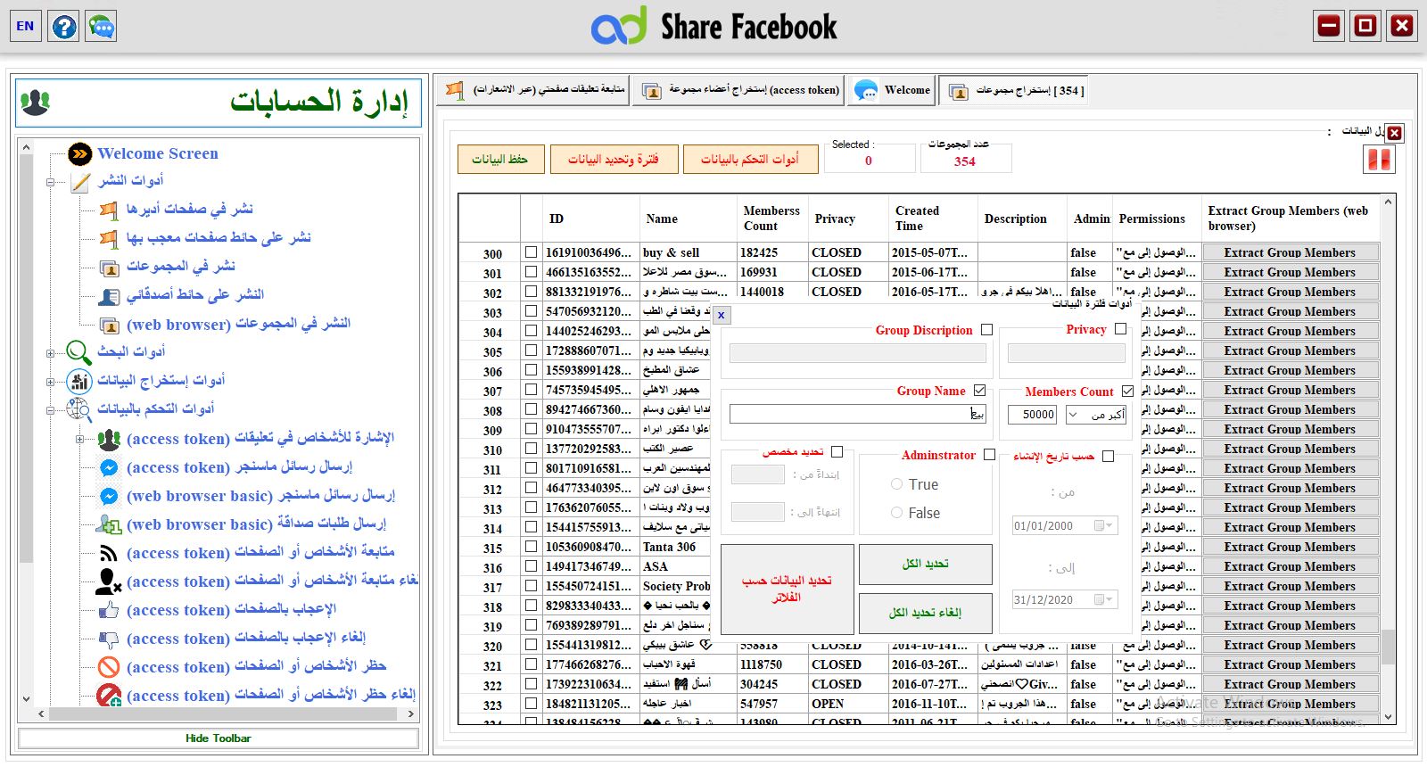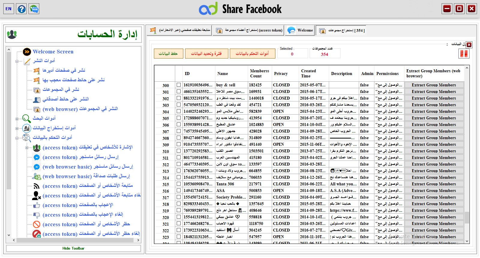 إستخراج المجموعات التي لدي عضويه بها أو التي إنضمت إليها صفحتي أو التي أديرها